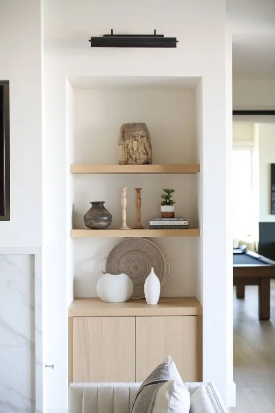 Also make sure that there is a variety in height and depth, this makes it dynamic as well. For example, place a bigger art frame at the back of the shelve and place 2-3 coffee table cooks horizontally in front with a small vase next to it. If your kids are smaller of you have a dog or cat running around, make sure that the breakable items are out of reach.